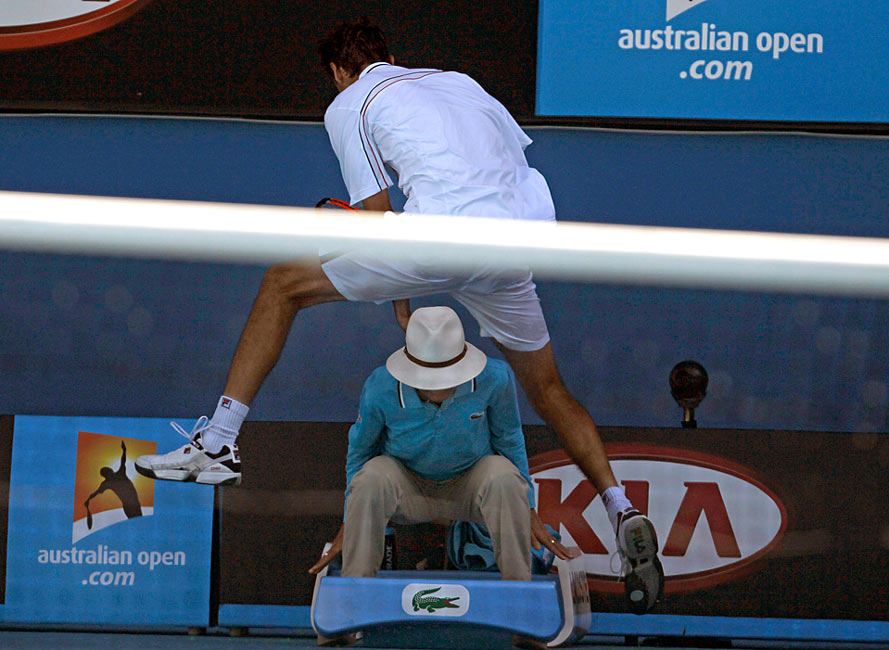 在澳網男子四分之一決賽上,克羅地亞選手西里奇(Marin Cilic)在對陣美國選手羅迪克(Andy Roddick)時為救球從邊裁頭頂跳過。