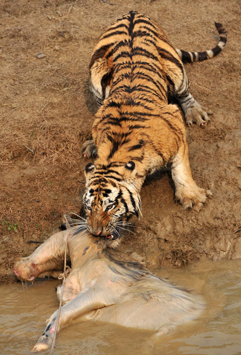 但水中的牦牛一動(dòng)彈,更加激發(fā)了老虎的野性,這時(shí)有三、四只老虎撲了上來(lái),工作人員拼命往水塘邊上拽牦牛,無(wú)奈一只虎王一下就咬住了牦牛的脖子怎么都不肯松口,繼而上演了人和老虎的“拔河比賽”。