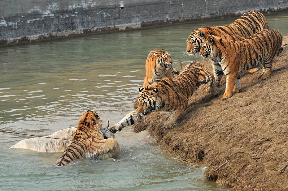 但水中的牦牛一動彈,更加激發了老虎的野性,這時有三、四只老虎撲了上來,工作人員拼命往水塘邊上拽牦牛,無奈一只虎王一下就咬住了牦牛的脖子怎么都不肯松口,繼而上演了人和老虎的“拔河比賽”。