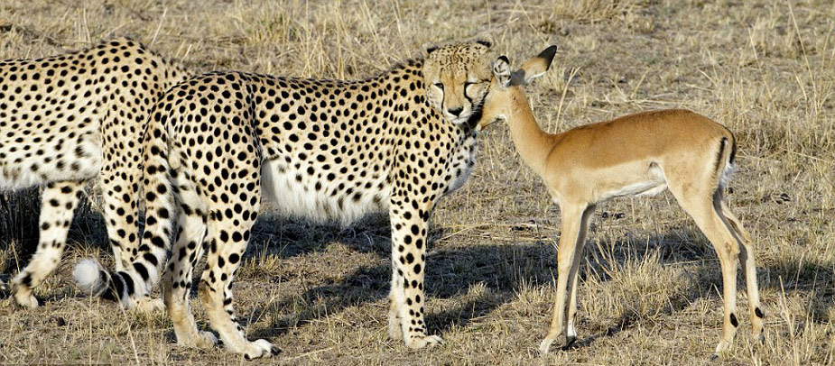 據英國媒體28日報道,一名在肯尼亞野生動物保護區拍照的攝影師拍到令人驚訝的畫面:三只獵豹與一只本是其獵物的小羚羊竟然和睦相處,共同嬉戲玩鬧,完全沒有危險“天敵”的概念。小羚羊最終毫發無傷地逃生成功。