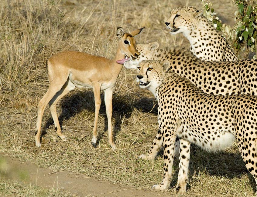 據英國媒體28日報道,一名在肯尼亞野生動物保護區拍照的攝影師拍到令人驚訝的畫面:三只獵豹與一只本是其獵物的小羚羊竟然和睦相處,共同嬉戲玩鬧,完全沒有危險“天敵”的概念。小羚羊最終毫發無傷地逃生成功。