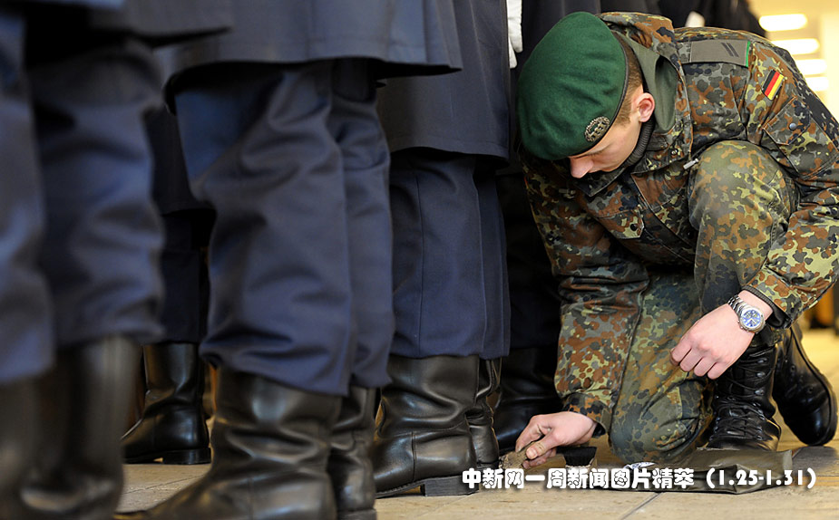 1月25日(周一),在柏林機(jī)場,為迎接以色列總統(tǒng)佩雷斯的到來。一名士兵正為儀仗隊(duì)士兵的皮靴上鞋油。圖片來源:中國新聞網(wǎng)