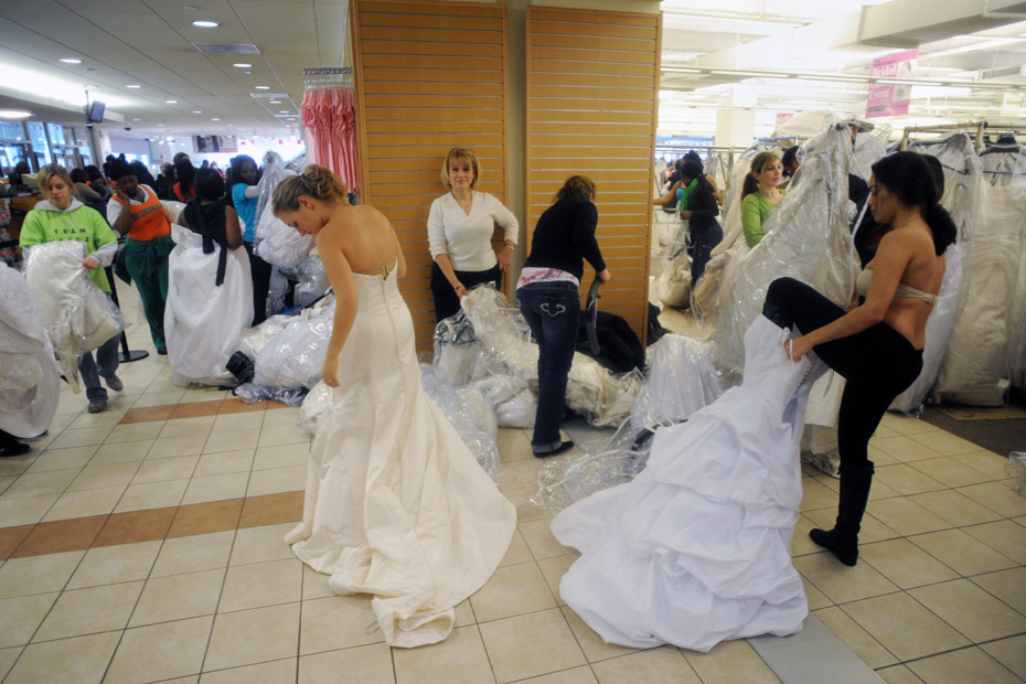近日,美國紐約一年一度的“新娘快跑”婚紗促銷活動舉行。千余名來自全美各地的準新娘和親朋好友,早早就在門口等候,平時上千美元婚紗只需要五分之一的價格就能帶回家。圖片來源:中國新聞網(wǎng)