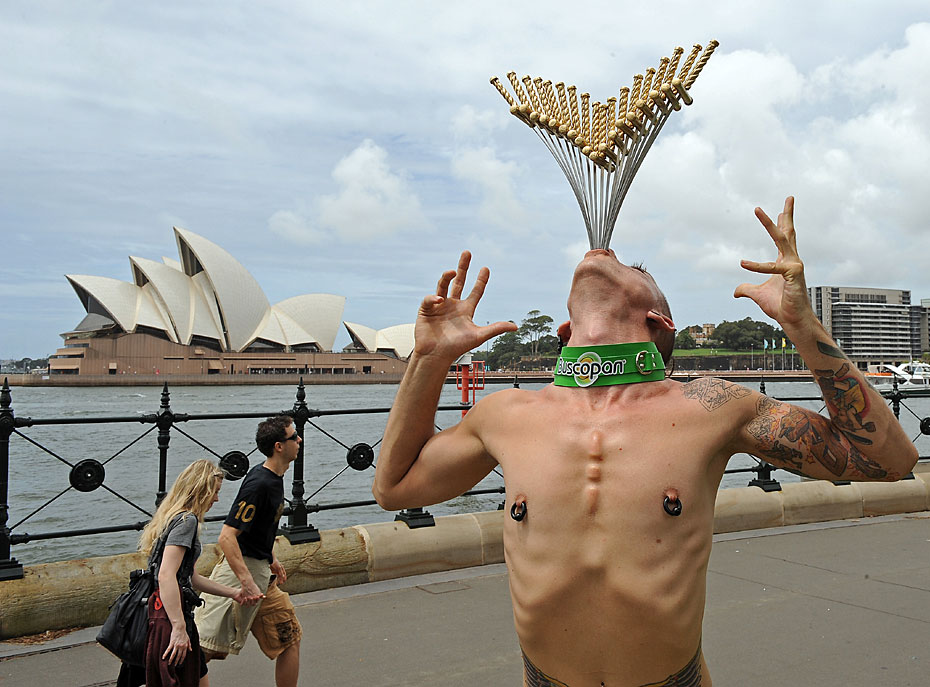 2月8日,街頭藝人Chayne Hultgren在澳大利亞悉尼海港大橋前,一次吞下18把厚約1.3厘米,長約50.8厘米的長劍,刷新了吉尼斯世界紀(jì)錄。圖片來源:中國新聞網(wǎng)