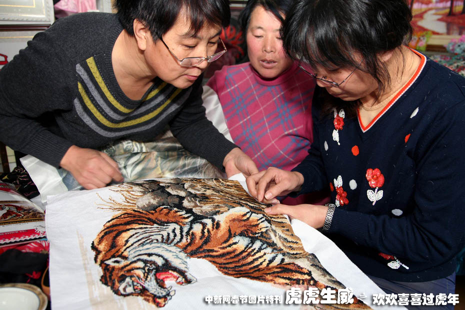 12月21日,市民們展示繡好的“虎年生肖”蘇繡作品。虎年臨近,北京市懷柔區泉河街道社區居民蘇繡“虎生肖”圖畫,抒發對新年的美好祝福和期盼,歌頌美好生活迎接虎年的到來。中新社發 卜向東 攝
