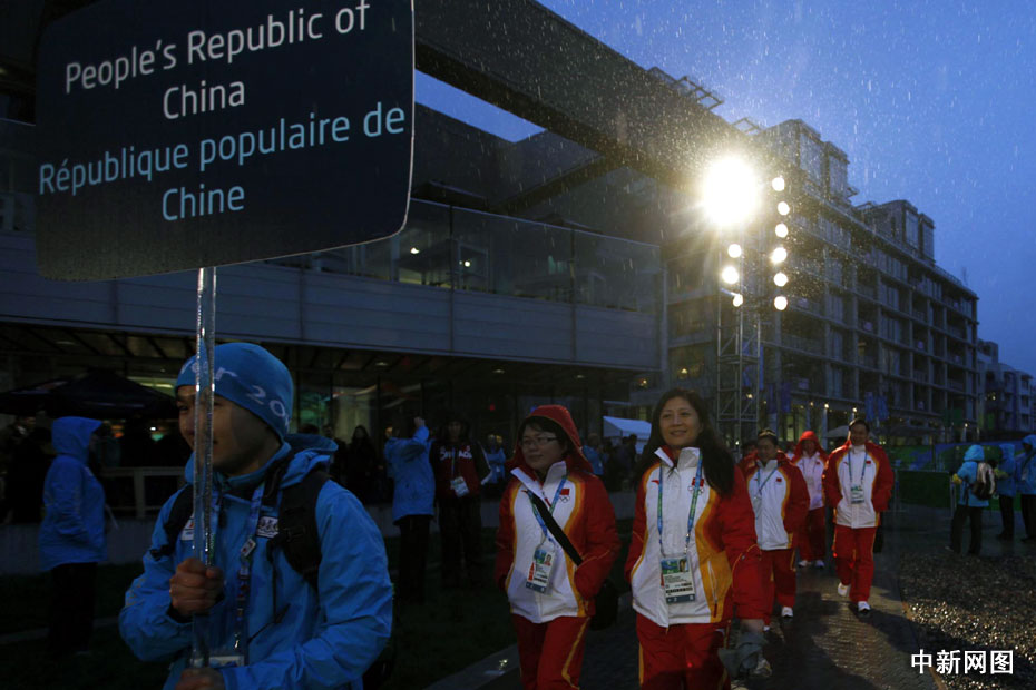 圖為中國冬奧代表團(tuán)冒雨參加升旗儀式。