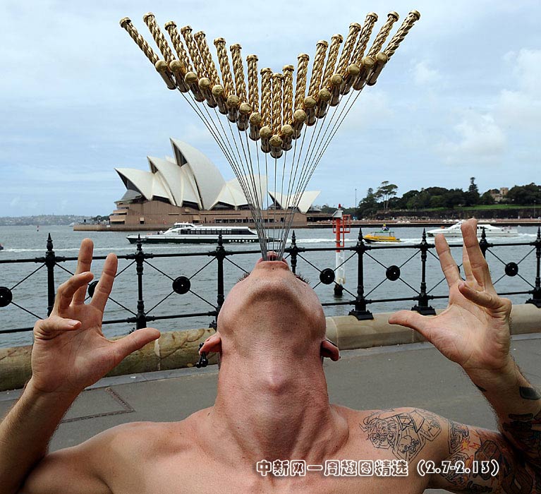 2月8日,街頭藝人Chayne Hultgren在澳大利亞悉尼海港大橋前,一次吞下18把厚約1.3厘米,長(zhǎng)約50.8厘米的長(zhǎng)劍,刷新了吉尼斯世界紀(jì)錄。圖片來(lái)源:中國(guó)新聞網(wǎng)>>點(diǎn)擊觀看詳細(xì)內(nèi)容