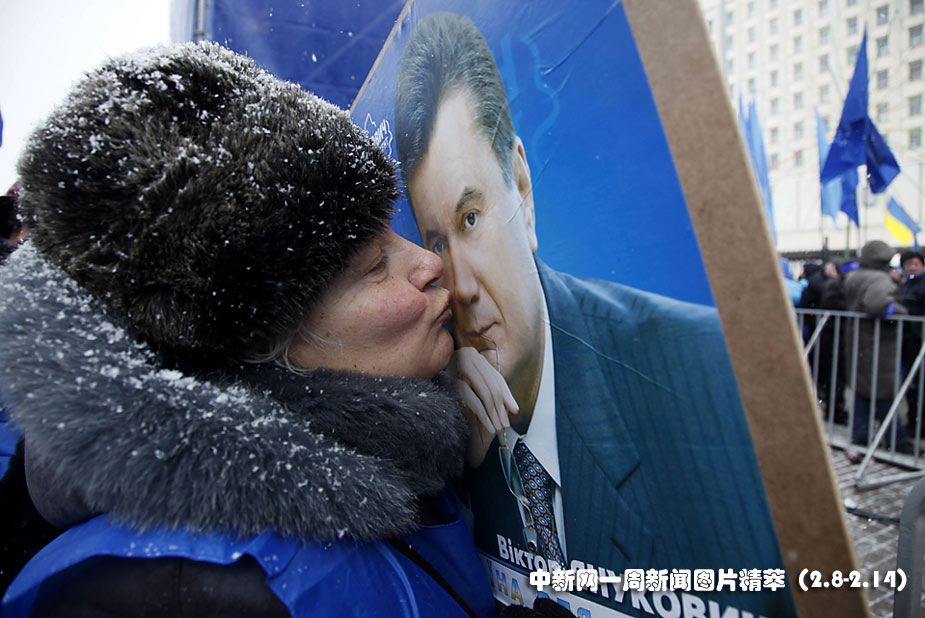 周一(8日)烏克蘭反對黨領袖、總統候選人亞努科維奇(Viktor Yanukovych)的支持者在基輔的一個集會上,親吻亞努科維奇的海報。大部分選票結果顯示,亞努科維奇在上周日的大選中戰勝了總理季莫申科。