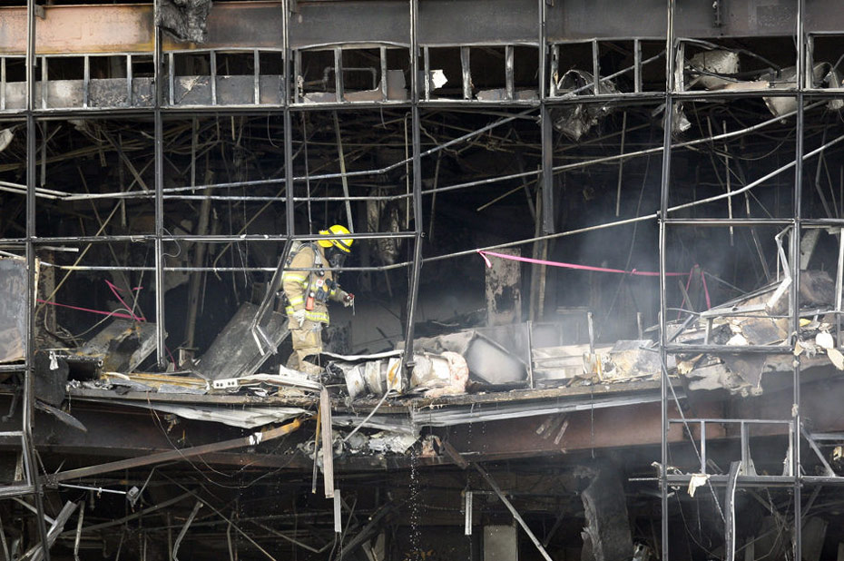 撞機事件導致大樓一面的幾十扇窗戶粉碎,一些樓層天花板塌陷,通過電視畫面,可以看到大樓二三樓層濃煙滾滾,黑煙中不時有竄出的火焰。