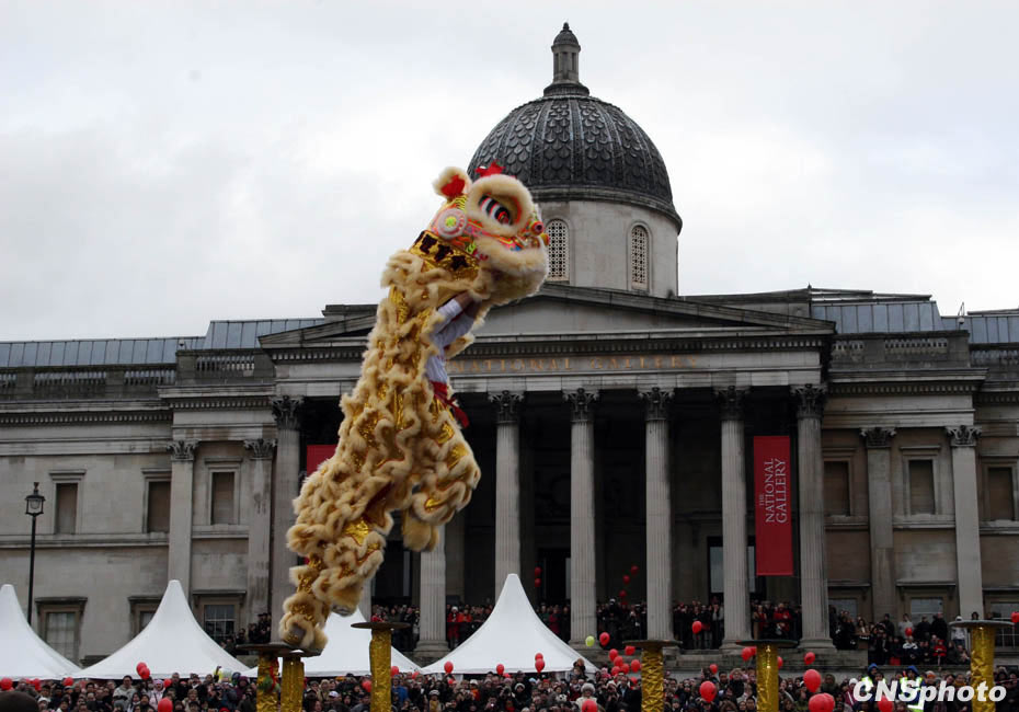 當(dāng)?shù)貢r間2月21日,亞洲之外最大規(guī)模的春節(jié)慶;顒——倫敦春節(jié)慶典在倫敦特拉法加廣場、萊斯特廣場及倫敦華埠舉行,圖為當(dāng)?shù)貎S社舞獅團(tuán)表演的“梅花樁”,令現(xiàn)場數(shù)萬觀眾發(fā)出驚嘆。 中新社發(fā) 魏群 攝