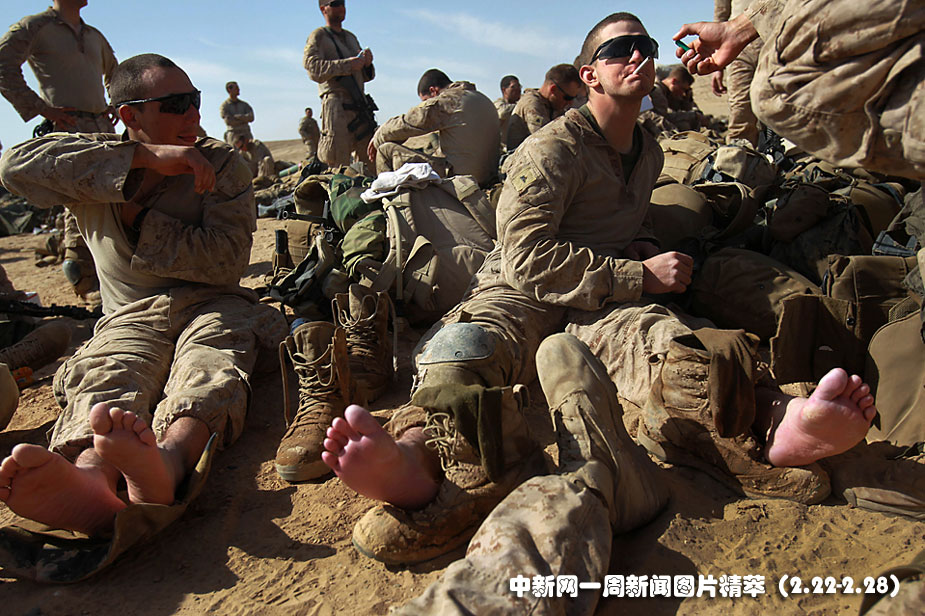 23日(周二),在阿富汗馬爾賈城,美軍陸戰隊士兵們在行動結束后坐下來休息。