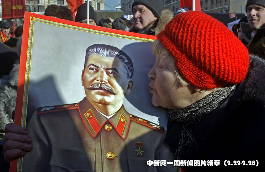 23日(周二)為慶祝俄羅斯祖國(guó)保衛(wèi)者日,共產(chǎn)黨員在莫斯科進(jìn)行了大游行。一位女士在游行中親吻斯大林的畫像。