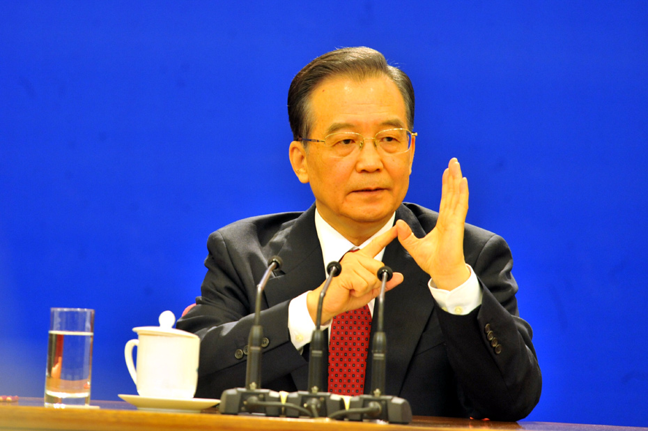 3月14日上午,國務(wù)院總理溫家寶在人民大會(huì)堂三樓金色大廳與采訪十一屆全國人大三次會(huì)議的中外記者見面并回答記者提出的問題。中新社記者 賈國榮 攝 圖片來源:中國新聞網(wǎng)