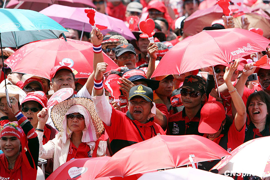 3月13日起,泰國“紅衫軍”陸續從泰國北部、東北部等外府進入曼谷市,在集會主會場搭設演講舞臺和帳篷,拉開大規模示威序幕。圖片來源:中國新聞網