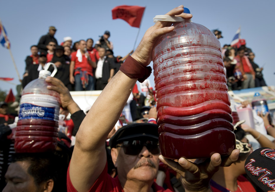 泰國反政府組織“紅衫軍”成員將血液潑灑在曼谷總理府門前,以此向政府施壓要求解散國會下議院。圖片來源:中國新聞網