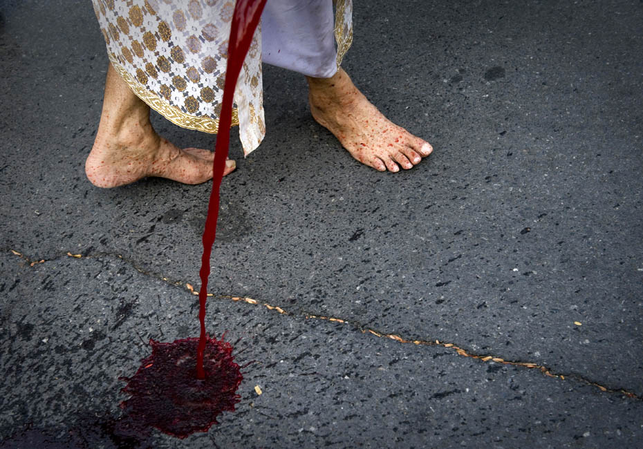 泰國反政府組織“紅衫軍”成員將血液潑灑在曼谷總理府門前,以此向政府施壓要求解散國會(huì)下議院。圖片來源:中國新聞網(wǎng)