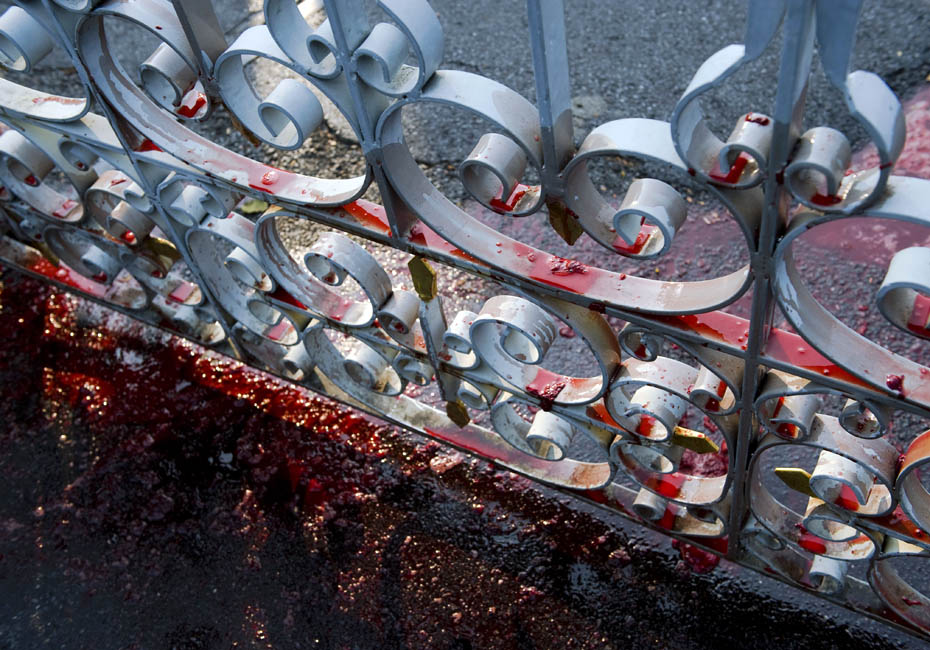 泰國反政府組織“紅衫軍”成員將血液潑灑在曼谷總理府門前,以此向政府施壓要求解散國會下議院。圖片來源:中國新聞網