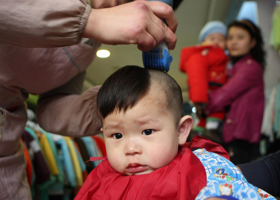 3月17日,寶寶在安徽淮北一家嬰幼兒服務店內“剃龍頭”。王文 攝