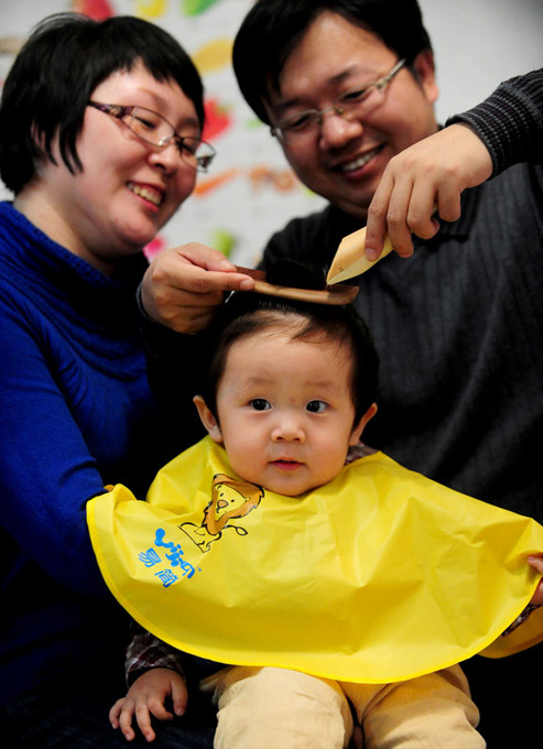 沈陽(yáng)一周歲的小寶寶王梓旭正在“剪龍頭”。紅帆 攝