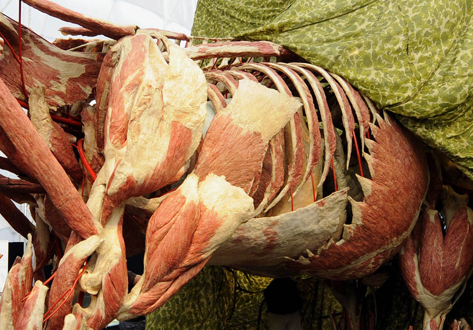 德國(guó)著名解剖學(xué)家鞏特爾·馮·哈根斯博士被稱為“死亡先生”,目前展出的是有史以來的最大的動(dòng)物尸體。體型巨大的“桑芭”尸體高3.5米,重3.2噸。據(jù)悉“桑芭”將于2010年4月歸還諾因基興動(dòng)物園。圖片來源:中國(guó)新聞網(wǎng)