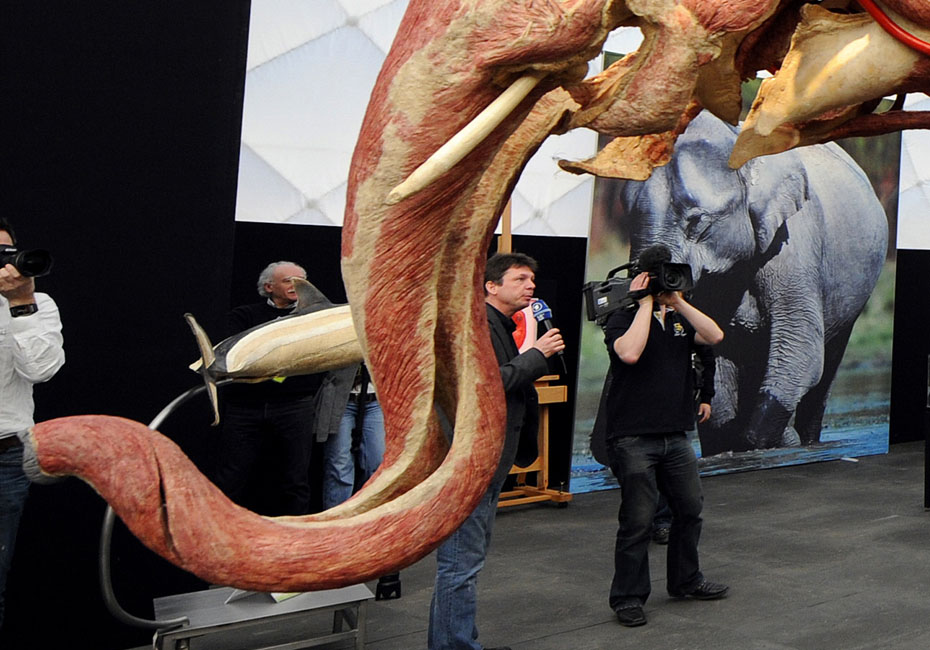 德國著名解剖學家鞏特爾·馮·哈根斯博士被稱為“死亡先生”,目前展出的是有史以來的最大的動物尸體。體型巨大的“桑芭”尸體高3.5米,重3.2噸。據(jù)悉“桑芭”將于2010年4月歸還諾因基興動物園。圖片來源:中國新聞網(wǎng)