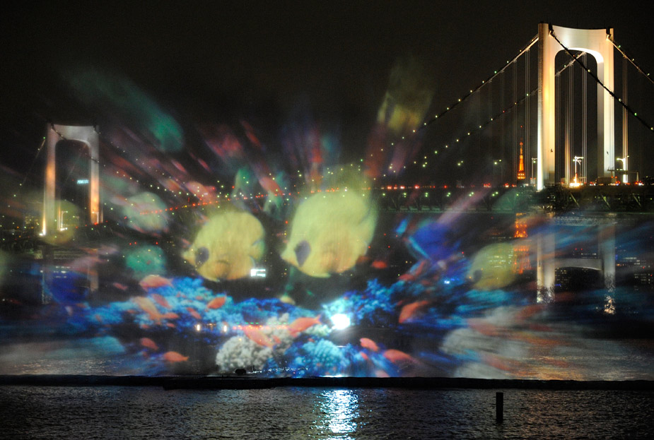 3月19日晚,在日本東京灣上演了一場美輪美奐的“海上幻燈”。東京灣的噴泉噴射出長60米、高23米的各種海洋生物的畫面,令人驚嘆。