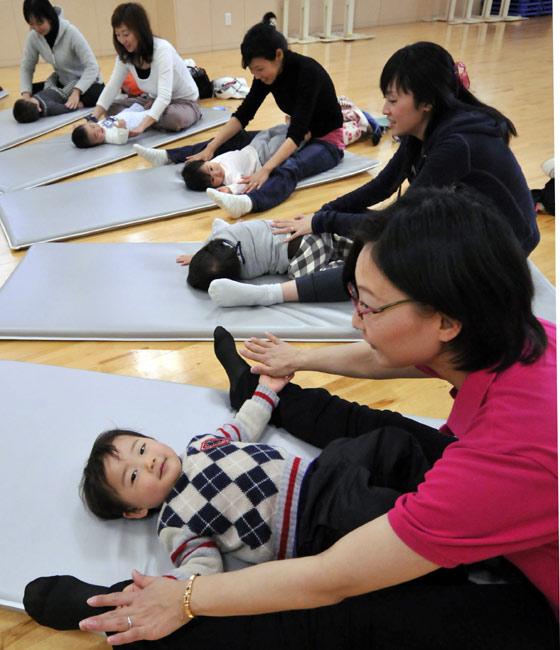3月24日,在日本橫濱市的一堂母嬰桑巴課上,媽媽們帶著自己的寶寶一起參加舞蹈訓練。 圖片來源:中國新聞網