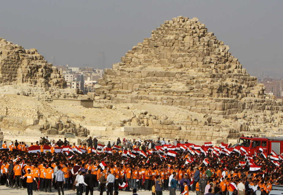 3月26日,4550名埃及兒童在首都開羅市郊的胡夫金字塔前揮舞埃及國(guó)旗,創(chuàng)造了在同一地點(diǎn)集體揮舞國(guó)旗的吉尼斯世界紀(jì)錄。