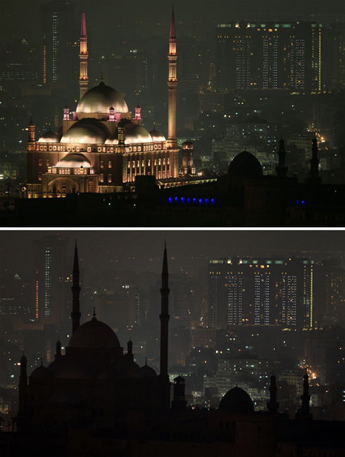 由世界自然基金會發起的“地球一小時”環保活動27日20點30分按照時區依次在全球數千個城市展開。圖為埃及伊斯蘭教清真寺在熄燈前和熄燈后的景色。