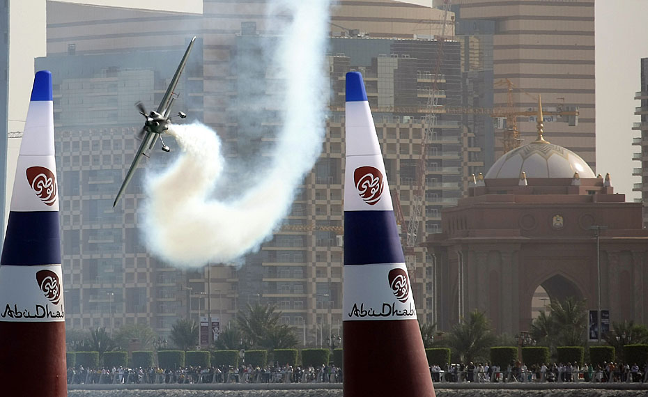 近日,紅牛飛行系列賽世界錦標賽預選賽在阿拉伯聯合酋長國阿布扎比舉行。參加比賽飛行員不但要有高速的駕駛技術,還要有勇往直前的膽量。圖片來源:中國新聞網