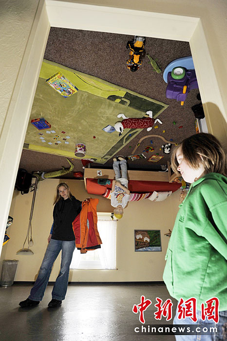 3月30日,德國蓋托夫市“瘋狂的房子”面向公眾開放。該房屋整個顛倒里面的家具也是被釘在屋頂上的。圖片來源:中國新聞網
