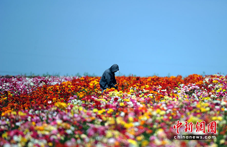 美國加利福尼亞州圣迭戈的卡爾斯巴德花田近日繁花盛開,姹紫嫣紅的花朵整齊地鋪滿在五十英畝的土地上,一望無垠的花海,美不勝收。圖片來源:中國新聞網