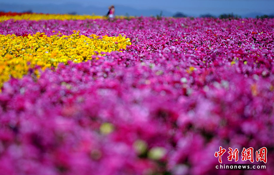 美國加利福尼亞州圣迭戈的卡爾斯巴德花田近日繁花盛開,姹紫嫣紅的花朵整齊地鋪滿在五十英畝的土地上,一望無垠的花海,美不勝收。圖片來源:中國新聞網