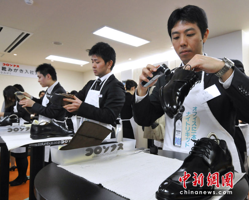 4月1日,日本一家鞋油廠新員工在入職儀式上為老員工擦鞋。圖片來源:中國新聞網