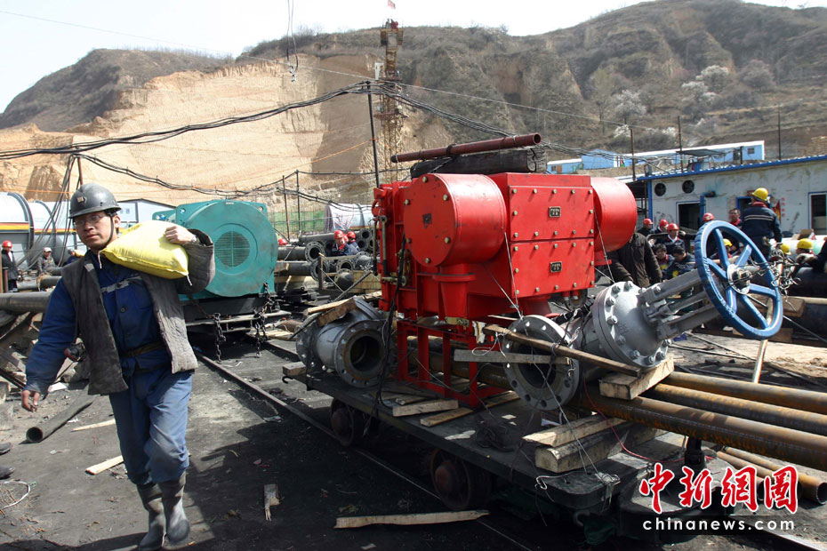 4月1日,“3·28”山西王家嶺透水事故進入第五天,由于排水進度緩慢,搜救人員還無法下井施救。圖為即將運送井下安裝的排水設備。中新社發 張云 攝