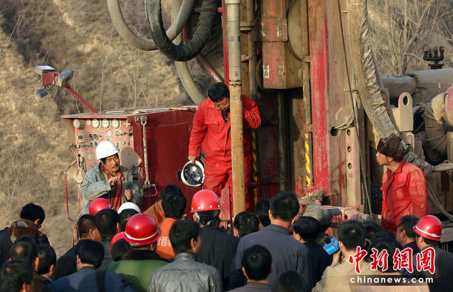 4月2日下午,華晉焦煤公司王家?guī)X礦透水事故搶險(xiǎn)人員為井下有生命跡象的2號(hào)垂直鉆孔輸送營(yíng)養(yǎng)液,并靜聽井下人員反饋回音。中新社發(fā) 張?jiān)?攝