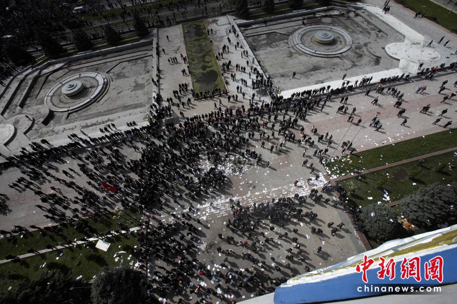 吉爾吉斯斯坦7日發(fā)生大規(guī)模騷亂,反對(duì)派示威者占領(lǐng)了議會(huì)大樓,8日,總統(tǒng)府也被示威者占領(lǐng)。圖為示威者聚集在總統(tǒng)府門前。