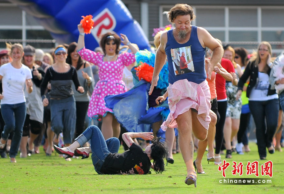 4月10日,在澳大利亞墨爾本,人們穿著高跟鞋賽跑。旨在挑戰多人穿高跟鞋賽跑的吉尼斯世界紀錄。盡管最終挑戰失敗,參賽者仍在80米的賽道上爭先恐后,各顯神通。