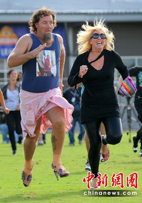 4月10日,在澳大利亞墨爾本,人們穿著高跟鞋賽跑。旨在挑戰多人穿高跟鞋賽跑的吉尼斯世界紀錄。盡管最終挑戰失敗,參賽者仍在80米的賽道上爭先恐后,各顯神通。