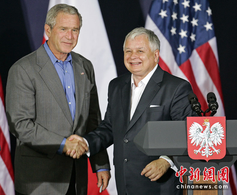 波蘭總統(tǒng)卡欽斯基乘坐的一架圖-154飛機(jī)10日在俄羅斯斯摩棱斯克州北部一軍用機(jī)場(chǎng)降落時(shí)失事,至少87人死亡。卡欽斯基本人被確認(rèn)身亡。圖為2007年波蘭總統(tǒng)卡欽斯基與美國(guó)前總統(tǒng)小布什。
