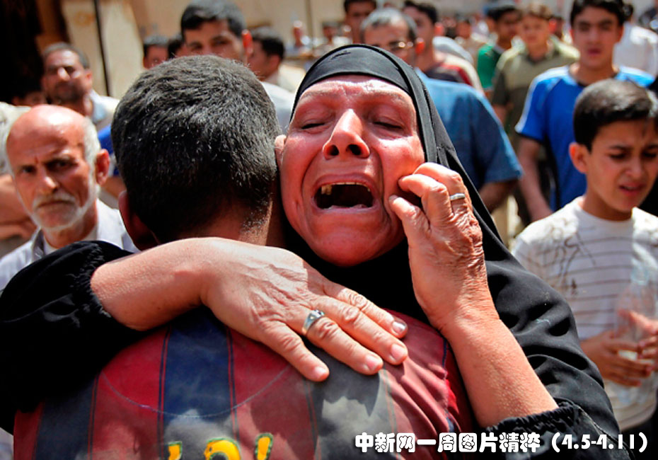4月6日周二,一名女子在巴格達市中心的爆炸現場放聲痛哭。全城至少有五枚安放在公寓樓中的炸彈爆炸,還有一個市場也受到了炸彈的襲擊。