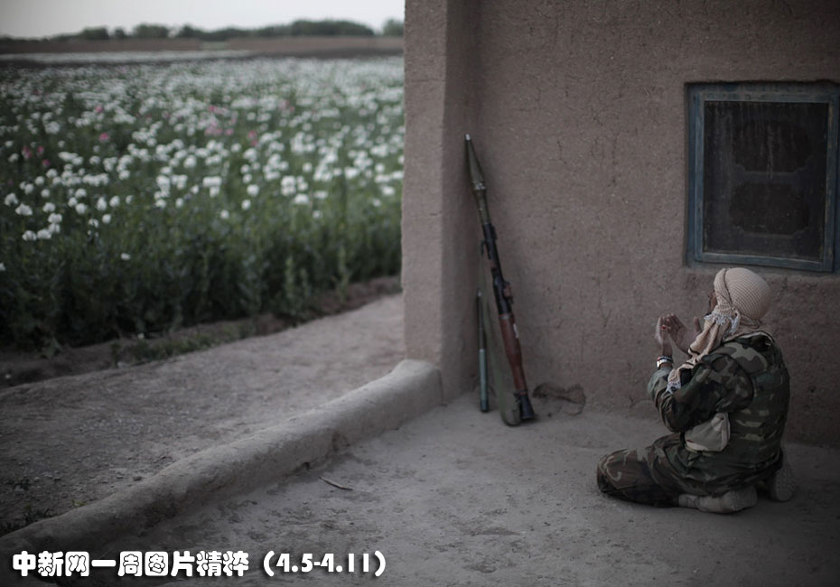 4月5日周一,在阿富汗南部赫爾曼德省馬爾賈地區(qū)的一處塔利班據(jù)點(diǎn),一名與未攝入鏡頭的美國海軍陸戰(zhàn)隊(duì)士兵徒步巡邏的阿富汗國家安全部隊(duì)?wèi)?zhàn)士正在進(jìn)行禱告,他的面前是一大片盛開的罌粟花。