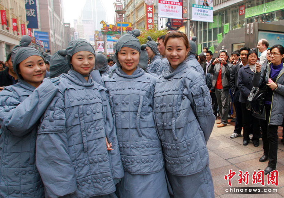 4月10日,由西安旅游局承辦的兵馬俑牽手上海世博會大型旅游宣傳咨詢活動舉行。來自兵馬俑故鄉的百人表演隊伍,身著灰色的兵馬俑服裝,以鏗鏘的節奏、雄壯的氣勢,在上海南京東路步行街和東方明珠廣場游演,吸引了大批市民及海內外游客駐足觀看。朱良城/CFP