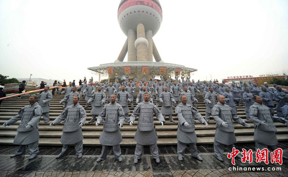 來自兵馬俑故鄉的百人表演隊伍,身著灰色的兵馬俑服裝,以鏗鏘的節奏、雄壯的氣勢,在上海南京東路步行街和東方明珠廣場游演。