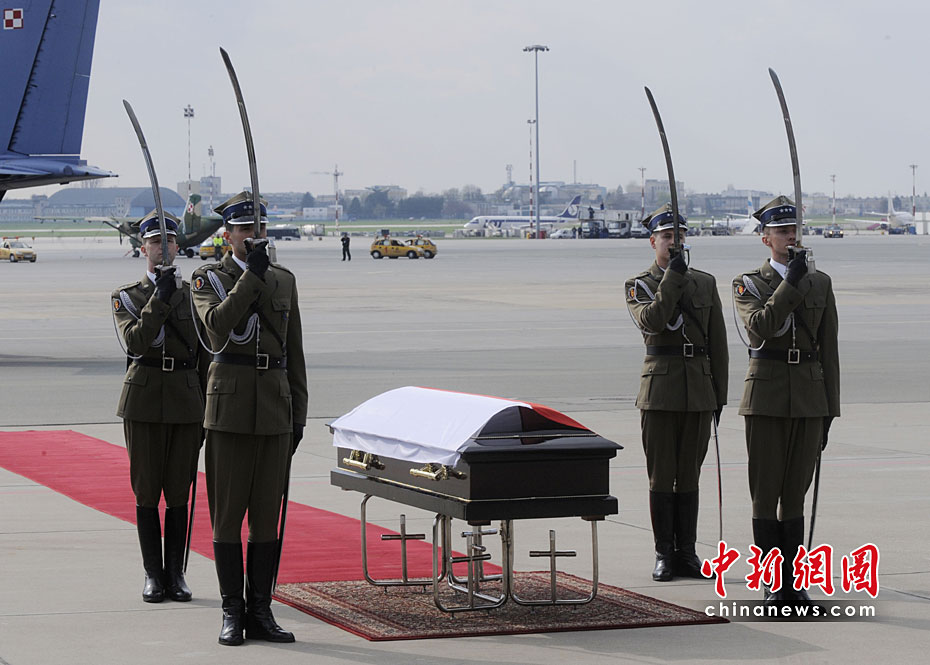 4月10日,卡欽斯基乘坐專機(jī)從華沙飛往俄羅斯斯摩棱斯克市,參加卡廷森林事件70周年紀(jì)念活動(dòng)。途中飛機(jī)在斯摩棱斯克“北方”軍用機(jī)場(chǎng)附近降落時(shí)失事,共造成包括卡欽斯基夫婦及眾多政府高官在內(nèi)的96人死亡。慘劇發(fā)生后,舉世震驚。圖為卡欽斯基的遺體抵達(dá)華沙。