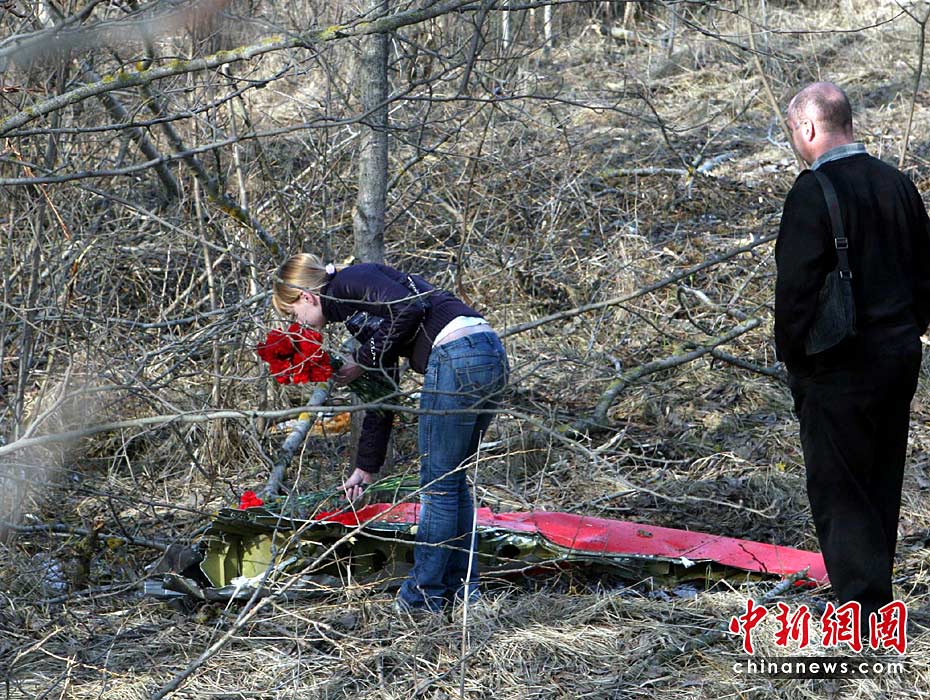 4月11日,波蘭總統卡欽斯基專機在俄羅斯斯摩棱斯克軍用機場墜毀地點附近的道路開通,但是警戒線核心區仍然關閉。俄波調查人員正在現場工作。圖片來源:中國新聞網