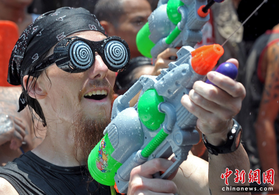 4月12日,泰國迎來一年一度的潑水節(jié),在拷桑路旅游區(qū)人們用水槍與大象“互噴”希望為對方送上祝福同時慶祝泰國新年。圖片來源:中國新聞網(wǎng)