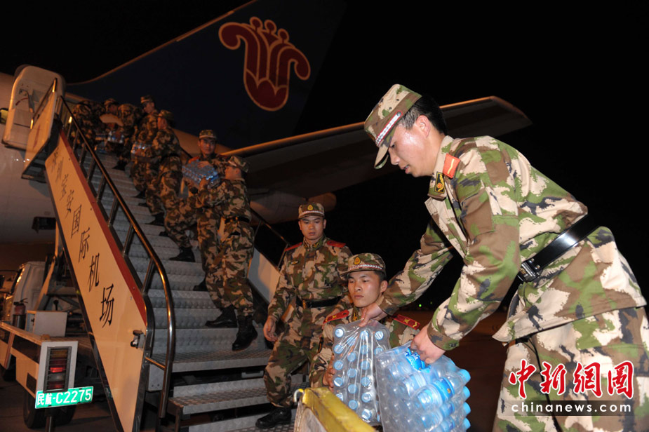 4月14日夜,廣東邊防總隊武警深圳醫院、深圳特檢站、六支隊、七支隊、邊防支隊組成的百余人醫療救援隊,攜救援物資乘南航包機趕赴青海玉樹地震災區。中新社發 陳文 攝