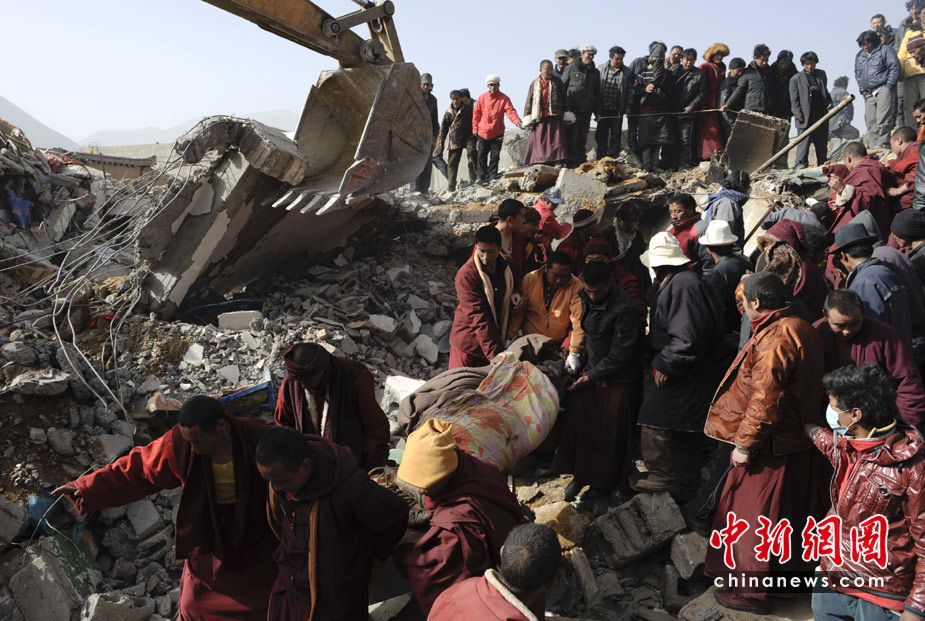 4月15日,青海玉樹縣勝利路口,玉樹當地僧侶和民眾正在積極救援被困廢墟的民眾。中新社發 廖攀 攝