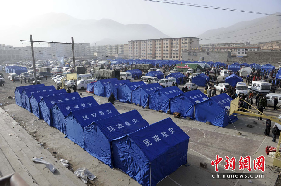 4月15日,青海玉樹縣體育場的地震災民安置點帳篷林立。目前青海省玉樹州“4·14”地震造成的死亡人數已上升至589人,10萬災民需要需要轉移安置。中新社發 廖攀 攝